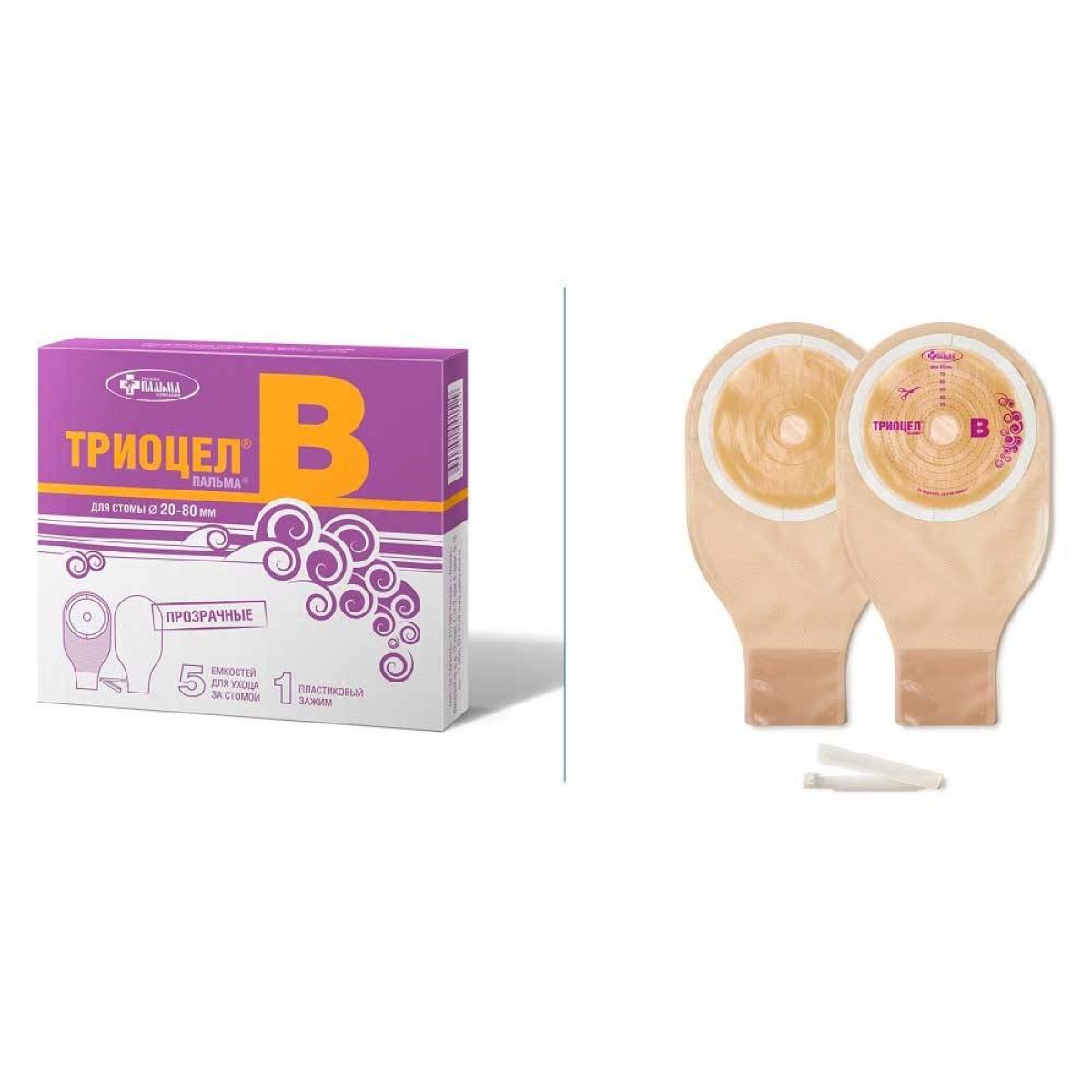 Калоприёмник ТРИОЦЕЛ-В предназначен для сбора выделений у пациентов с коло- и илеостомой и состоит из ёмкости, системы крепления и запорного элемента.