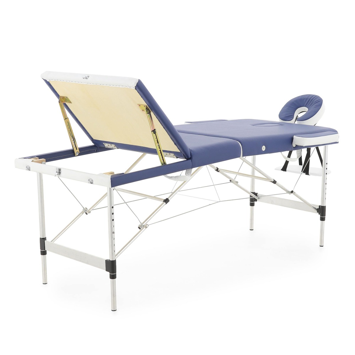 Трёхсекционный массажный стол, рама которого изготовлена из прочного алюминия. Выдерживает повышенную нагрузку до 220 кг, при собственном относительно небольшом весе.