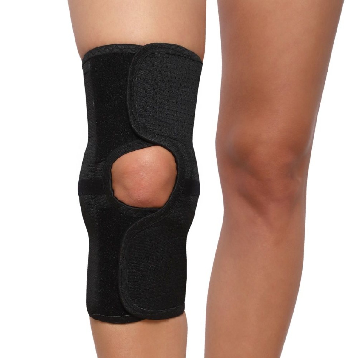 Расположите бандаж на ноге так, чтобы разъемное отверстие находилось посередине коленной чашечки, а боковые шарниры по наружной и внутренней поверхностям коленного сустава
