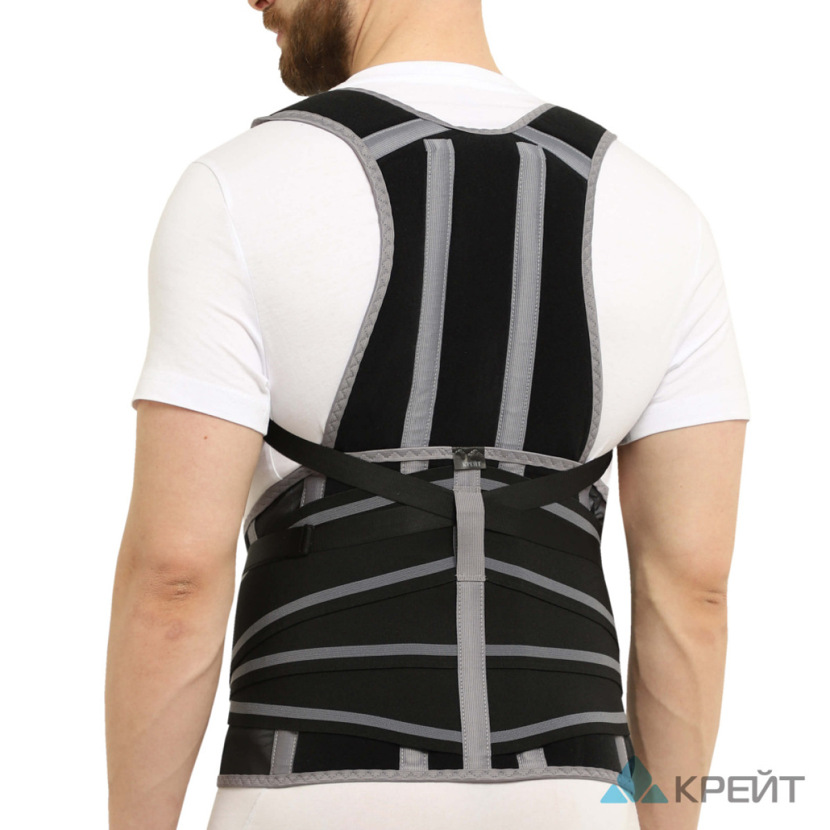 На изделии серым кантом выделены серединный и плечевые швы, что позволяет более правильно и точно надеть и подогнать изделие по фигуре. Также серыми кантами выделено количество и месторасположение (а следовательно и зона воздействия) фиксирующих ребер жесткости. Указанные нюансы позволяют более быстро и легко сориентироваться в изделии – определить количество и зону воздействия ребер жесткости.