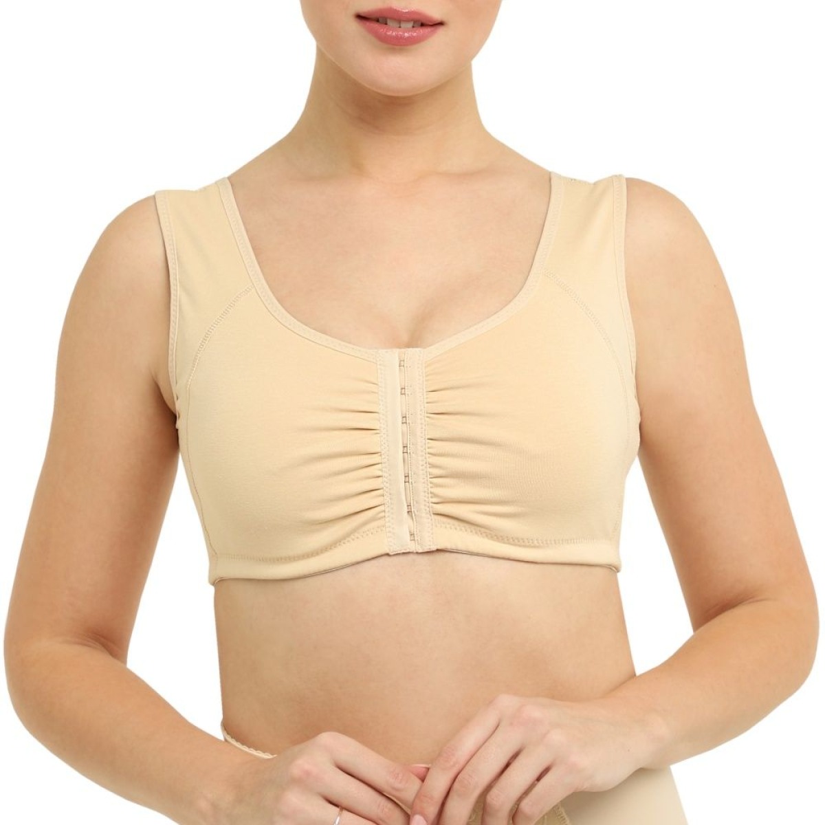 Двухрядная застежка на крючки спереди позволяет надеть бюстгальтер без посторонней помощи и болезненных ощущений (в отличие от застежки сзади, при застегивании которой может возникать боль в руках и растяжение послеоперационных швов)