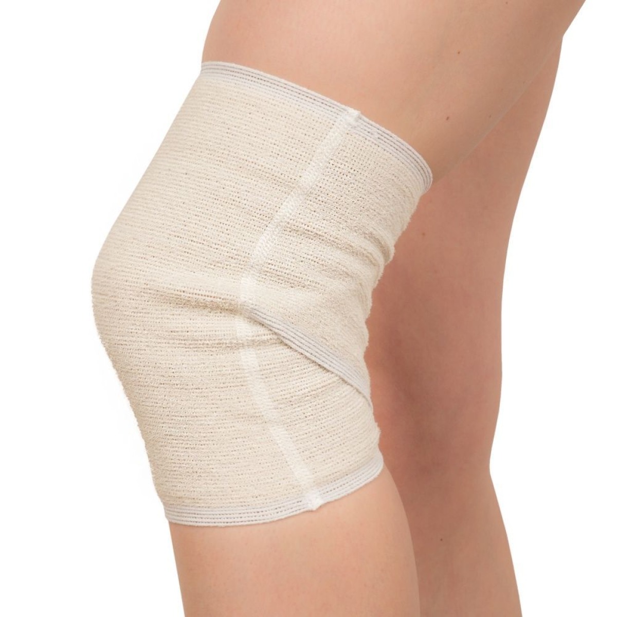 Бандаж сшит из двух перекрещивающихся полотен, благодаря чему комфортно лежит на коленной чашечке, не препятствует сгибанию