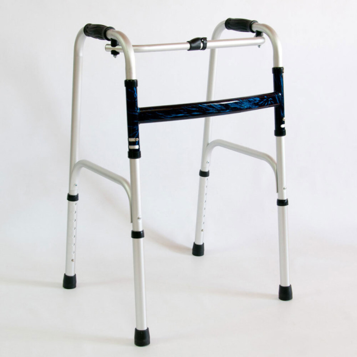 Опорные поручни ходунков выполнены из анодированного алюминия и не подвергаются коррозии, соединяющая рама – из стали с полимерным покрытием. Ходунки легко складываются и не занимают много места, имеют 8 положений регулировки высоты с шагом в 2,5 см. Мягкие накладки на поручнях ходунков не дают рукам скользить. Резиновые наконечники на опорах ходунков предохраняют от скольжения по твердым поверхностям.