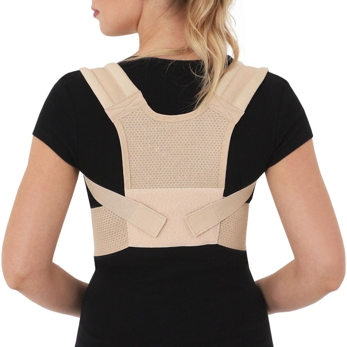 Легкий корректор осанки из перфорированного воздухопроницаемого материала практически незаметен под любой одеждой