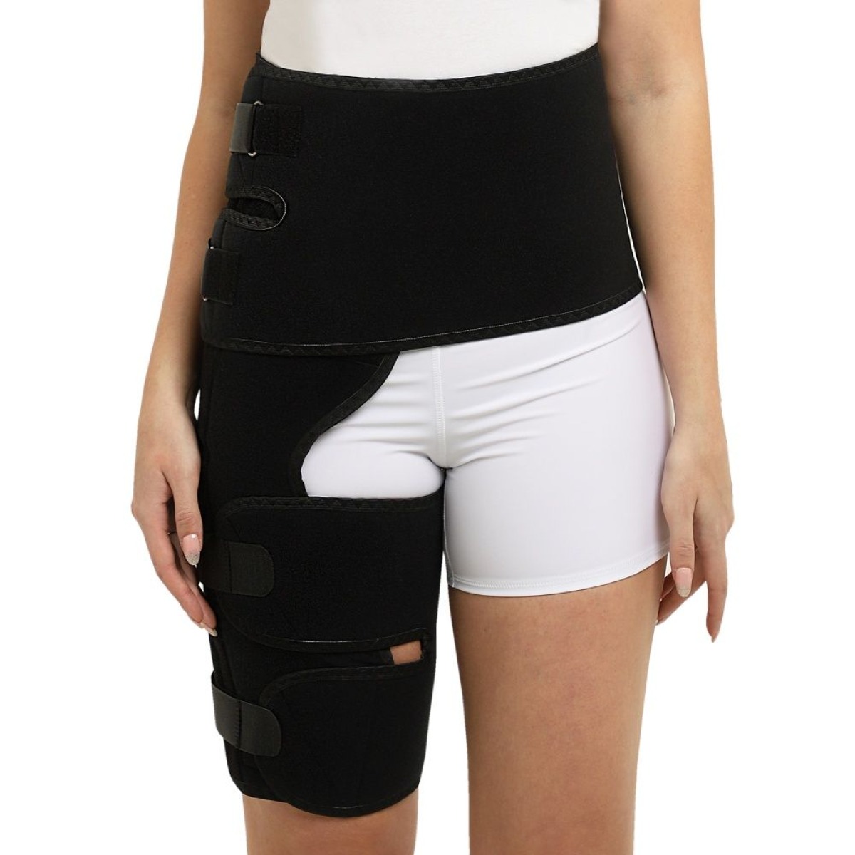 Нижнюю часть изделия зафиксировать вокруг бедра клапанами с застежкой Velcro, не сдавливая его до нарушения кровообращения. Отрегулировать степень фиксации бандажа на животе и на бедре дополнительными ремнями с застежками Velcro