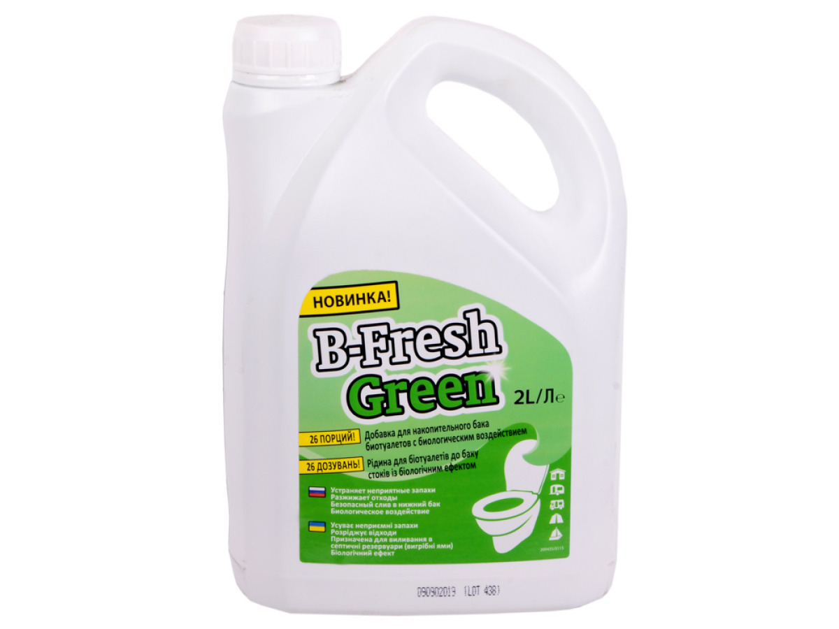используется в нижних баках биотуалетов для расщепления отходов. Это экологически чистый продукт, разработанный компанией Thetford. Жидкость B-FreshGreen заливается в нижний бак, и биологически расщепляет до 90% ПАВ (поверхностно-активных веществ). Растворяет твердые отходы, минимизирует образование газов, улучшает проходимость слива и делает бак более чистым. Кроме того, идеально устраняет неприятные запахи и имеет отличный освежающий эффект. Жидкость действует 3-4 дня, после чего ее нужно залить снова. Экологически чистый расщепитель не вызывает раздражений кожи, может применяться на дачных участках, поскольку не вредит почве. В составе B-FreshGreen не используются формальдегиды.