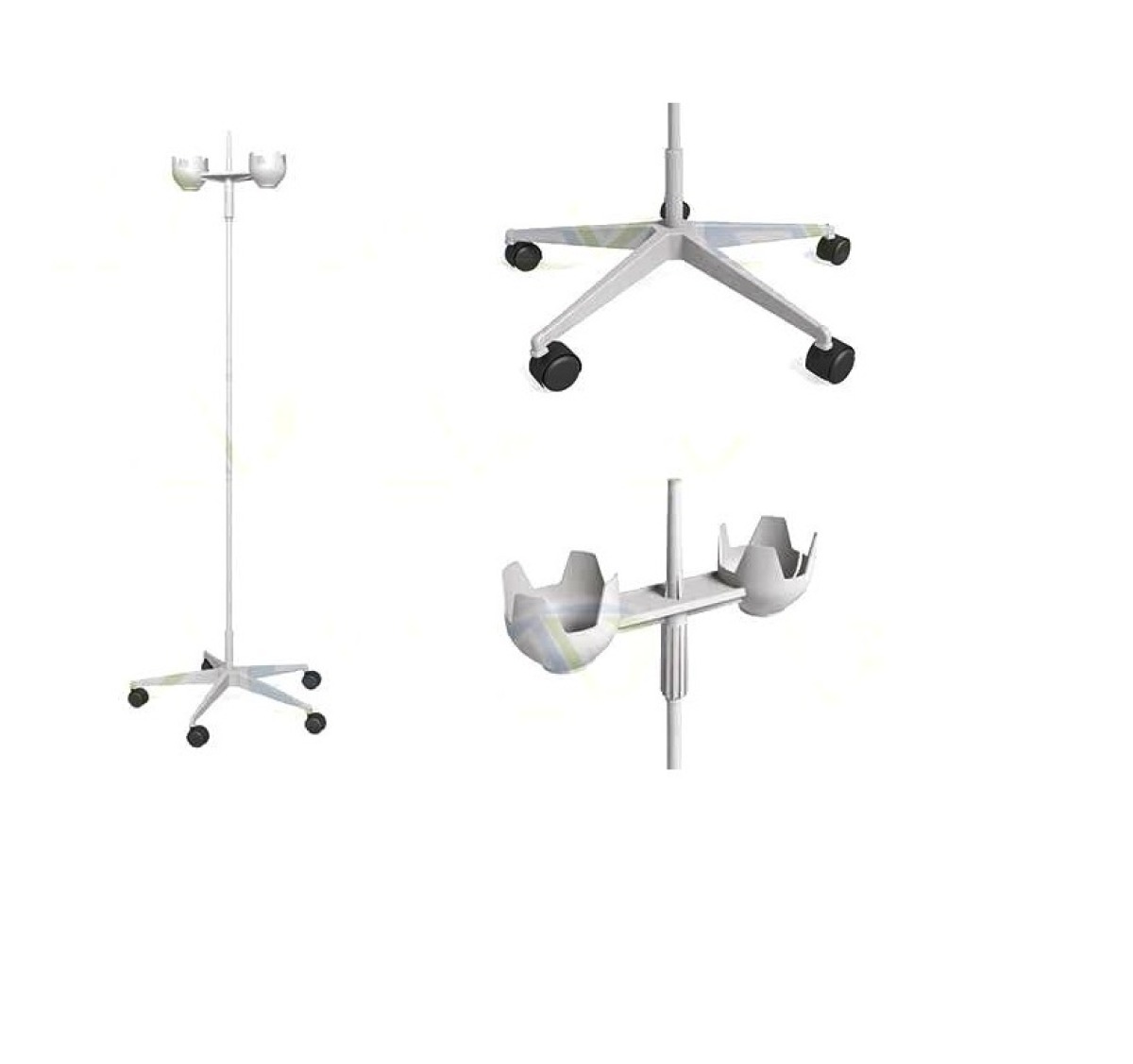 Штатив предназначен для размещения флаконов и одноразовых систем с лекарственными растворами, используемыми при проведении лечебных процедур Стойка — стальная тонкостенная труба с полимерно-порошковым покрытием Пятилучевое пластиковое основание на мебельных пластиковых колёсах Пластиковый держатель для 2-х флаконов с жидкостью, регулируемый по всей высоте стойки