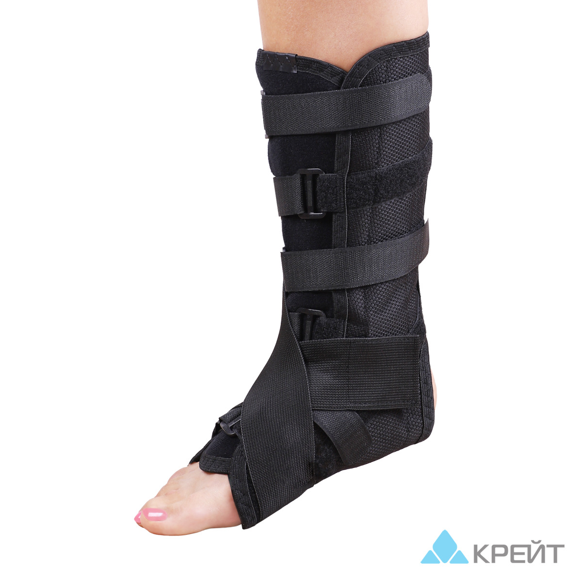 Имеет 2 съемных пластиковых ребра жесткости для фиксации ступни и 2 анатомические съемные пластиковые пластины, фиксирующие лодыжку по вертикали